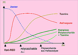 Opti-RED bringt eine Verbesserung dieser Qualitätsmaßnahmen: die Zugabe dieses Heferindenproduktes bereits zur Maische/Most vor der Gärung ermöglicht die Reaktion mit den Tanninen schon zum Zeitpunkt deren Freisetzung aus den Beerenschalen.
